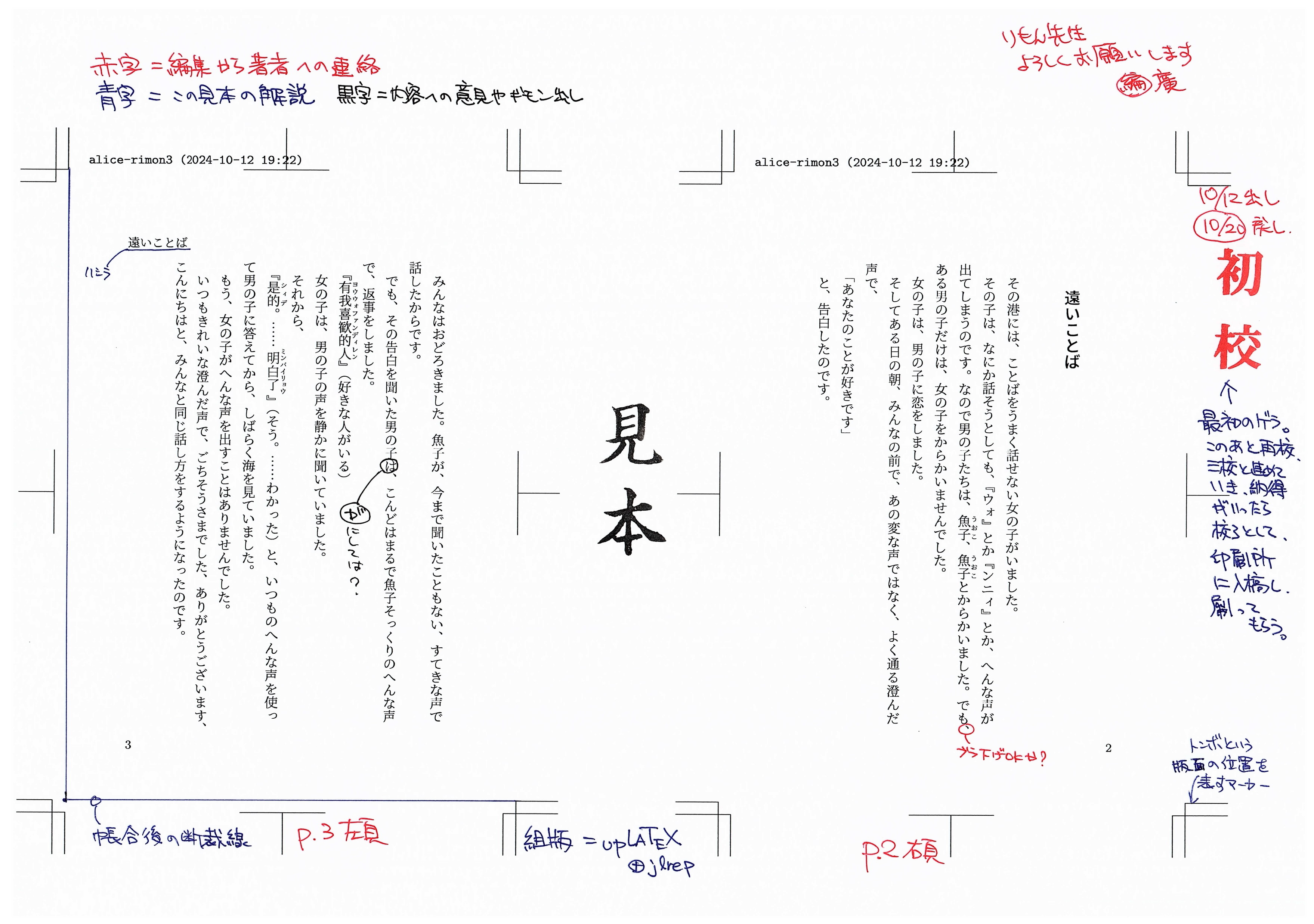 青焼き校正:印刷入稿したあと印刷所が出してくれる製版のコピー。昔は製版フィルムを原寸で青いジアゾ感光紙にコピーしていた。今は白い普通紙のA全プリンタ出力を面付どおりに折って断裁して出してくれる。印刷工程上は刷る直前の校正であり、編集にとっては最終校正。青校を戻せば校了となり、その仕事が完遂したことになる。↩︎